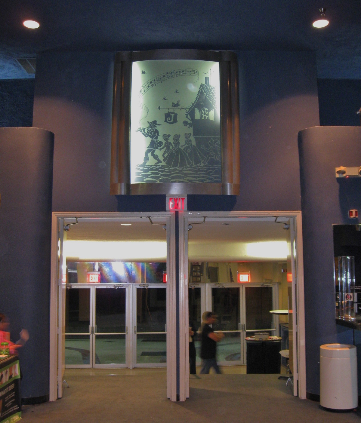 It’s an old place, classic, but not in a self-consciously retro sort of way, it’s just distinctly ‘of the past’. The Josephine opened its doors in 1947 and, as was common for the era, had a now-unthinkably huge 700+ seating capacity to accommodate all the surrounding neighborhoods. Like many other classic movie theaters, it faced a slow decline during the 70’s culminating in bankruptcy, but the Josephine was among the theaters lucky enough to be saved. Standing inside, I’m greeted with a cool-blue interior decorated with large etched-glass depictions of fairy tale characters. It’s dark, with the muted elegance of a Bogart-era nightclub. Now sporting a bar and lounge-area and a more reasonable amount of seats, the Josephine is looking a little more modern, but its old-fashioned charm still shines through.